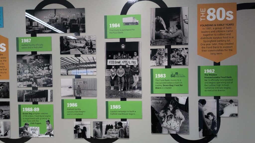 The Food Bank was officially incorporated in 1982, and within a year they had started their Brown Bag program; an ongoing once-a-month bag of groceries intended to help qualifying folks aged 55 and up to meet dietary standards. From ‘86-’87 they started, finished, and opened their first distribution facility in Hatfield. By the early 90s, they had started growing their own food – and then bought the farm. By the late 90s, their work helped establish the Massachusetts Emergency Food Assistance Program (MEFAP).